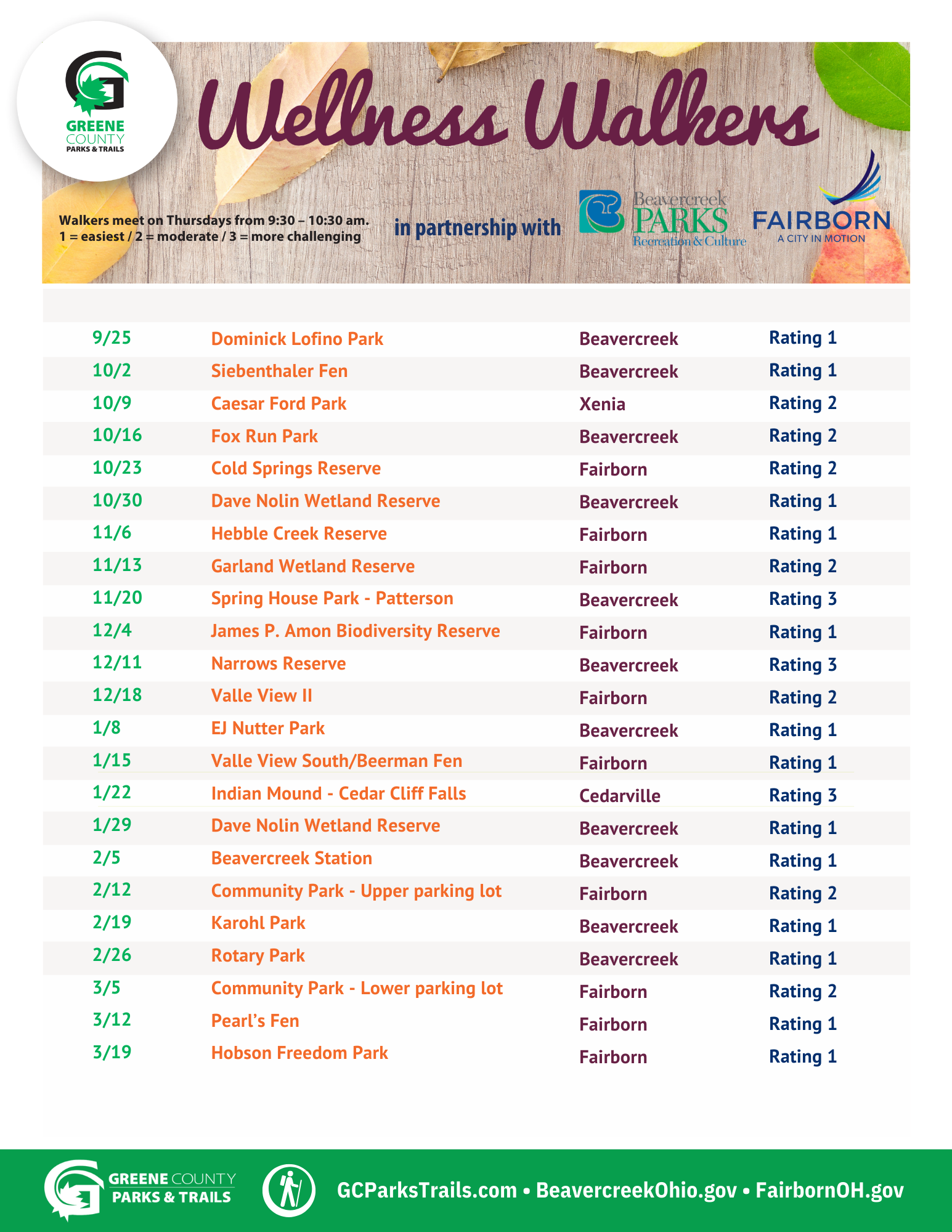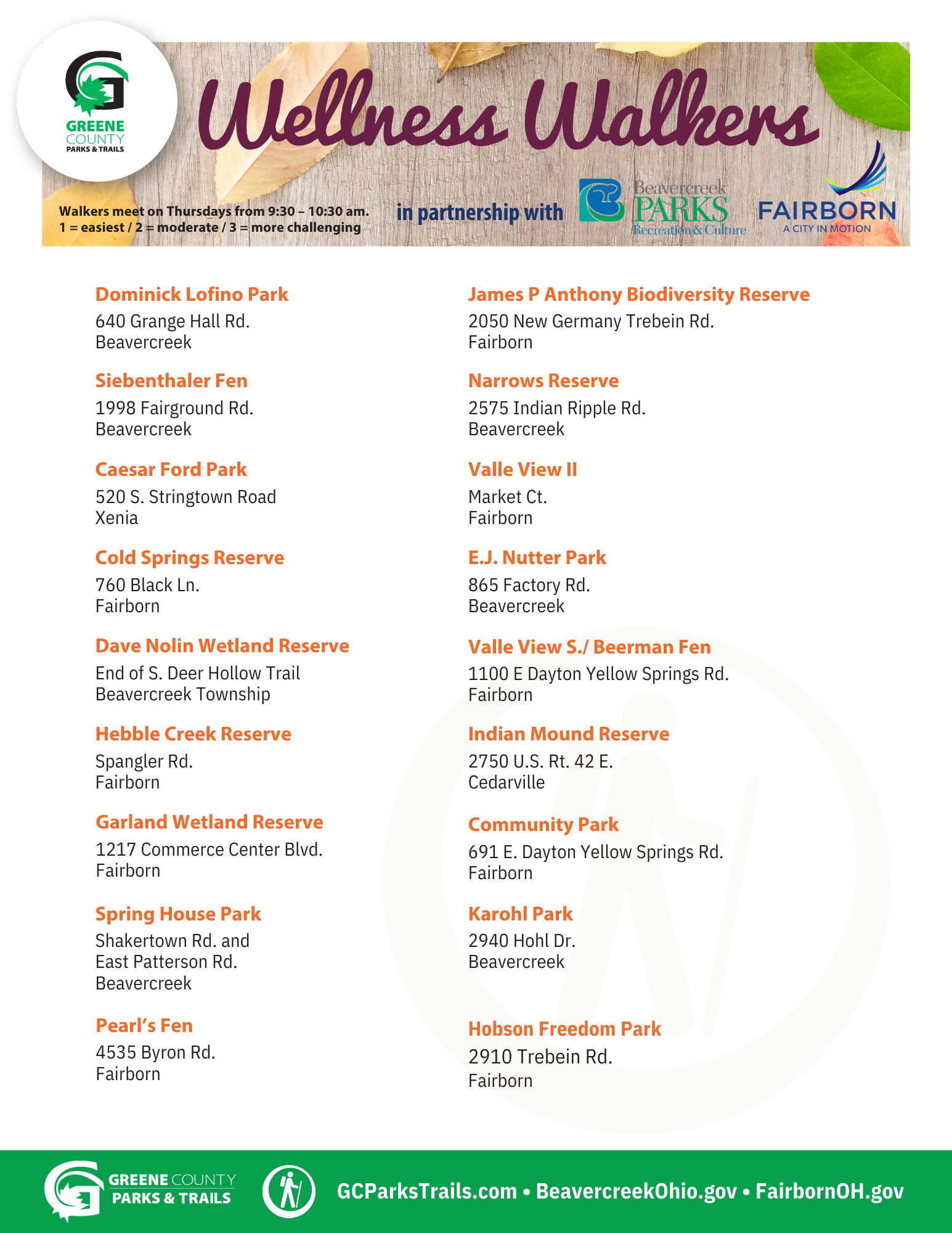 Each week, we will get our heart rate up and get moving while enjoying the outdoors in our beautiful parks. Walks are guided and self-paced. Greene County Parks & Trails, Fairborn Parks and Recreation and the City of Beavercreek Parks Department have teamed up to provide walks all over Greene County.